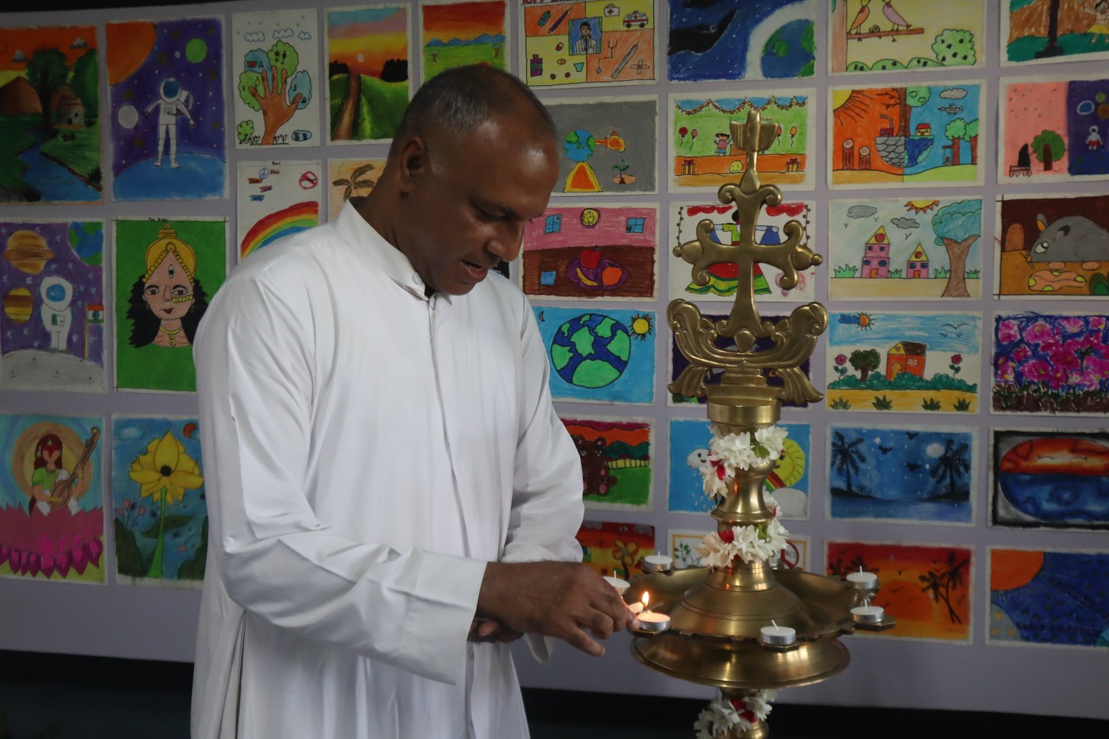 The exhibition was thoughtfully divided into three thematic categories: For students from Class 1 to 4, the category “Exploratory Themes” allowed the youngest learners to explore art as a joyful discovery. Their artwork was full of colour, innocence, curiosity, and the natural wonder with which children view the world. Many of these works reflected scenes of family, nature, animals, friendship, and everyday acts of kindness. Students from Class 5 to 7 participated under the category “Footprints of Love.” Here, the focus shifted to artworks that represented empathy, care for others, and the beauty of relationships that support and nurture growth. Students expressed themes such as helping the needy, protecting the environment, cherishing family bonds, and respecting elders. The artworks showed thoughtful selection of colour palettes and growing confidence in technique. The underlying message was clear and powerful: love leaves traces wherever it goes. For the senior group, Class 8 to 12, the category “Footprints of Hope” encouraged reflection on challenges, aspirations, resilience, and the call to be messengers of hope in the world. Their works were profound and expressive, dealing with themes such as peace-building, inclusion, climate responsibility, faith in adversity, the impact of AI and the importance of collective human effort. This section drew many viewers to pause and contemplate.