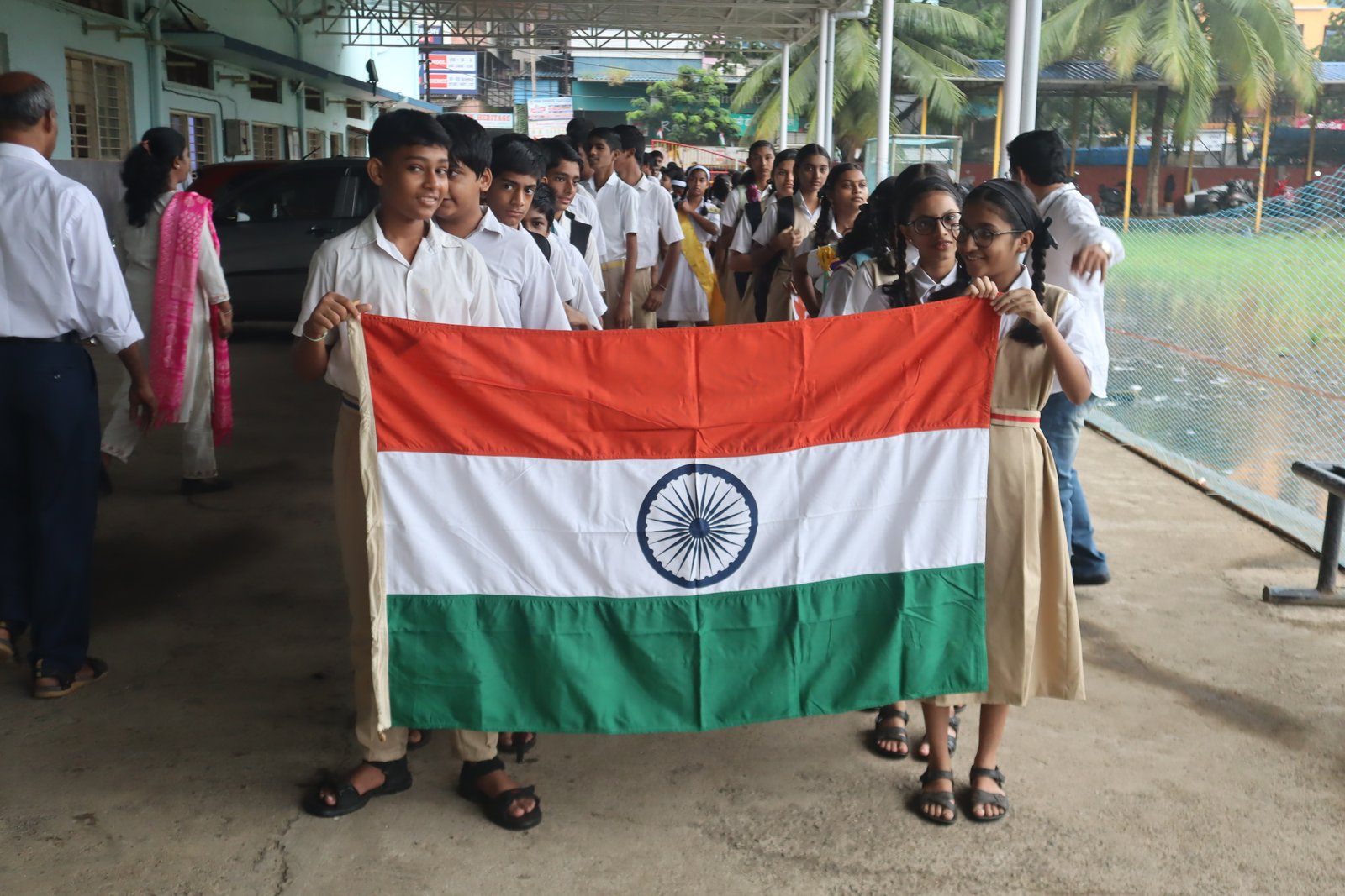 On August 15th, the celebration began with a spirited Prabhat Ferri, where students marched with pride, raising slogans of patriotism that echoed through the surroundings. The highlight of the morning was the flag hoisting ceremony. The flag was hoisted by Mr. Sanjeev Majumdar, Supervisor of the College Section, together with Mrs. Antonio Sa, a valued support staff member who is soon to retire. Their participation lent a special significance to the occasion.