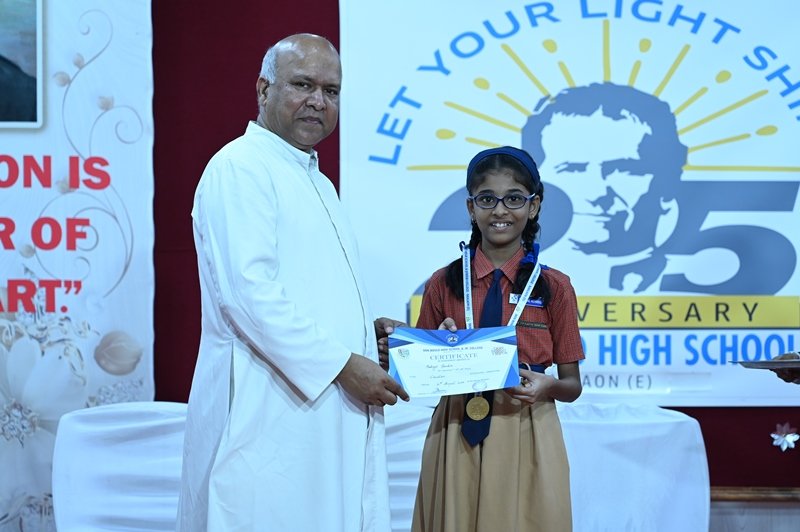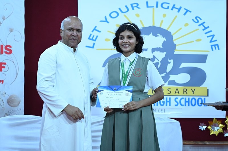 Tr. Resal introduced the distinguished judges, Mrs. Jeannetta Noronha and Ms. Scarlett Nair D’Souza. Mrs. Noronha, a postgraduate in English Literature and a dedicated professor, is also an active volunteer with the Prison Ministry in Mumbai. Ms. Scarlett Nair D’Souza, a counselor with 21 years of experience and a strong advocate for animal welfare, was equally celebrated. The school presented each judge with a sapling symbolizing growth, wisdom, and compassion, as a token of appreciation. The competition, themed around ‘Peace and Care for Creation’, featured participants from various schools, each delivering their speeches in English, Hindi, and Marathi, with remarkable eloquence. The speeches covered diverse topics, reflecting the creativity and intellect of the young speakers. After an intense and captivating round of speeches, the winners were announced. They are as follows:
