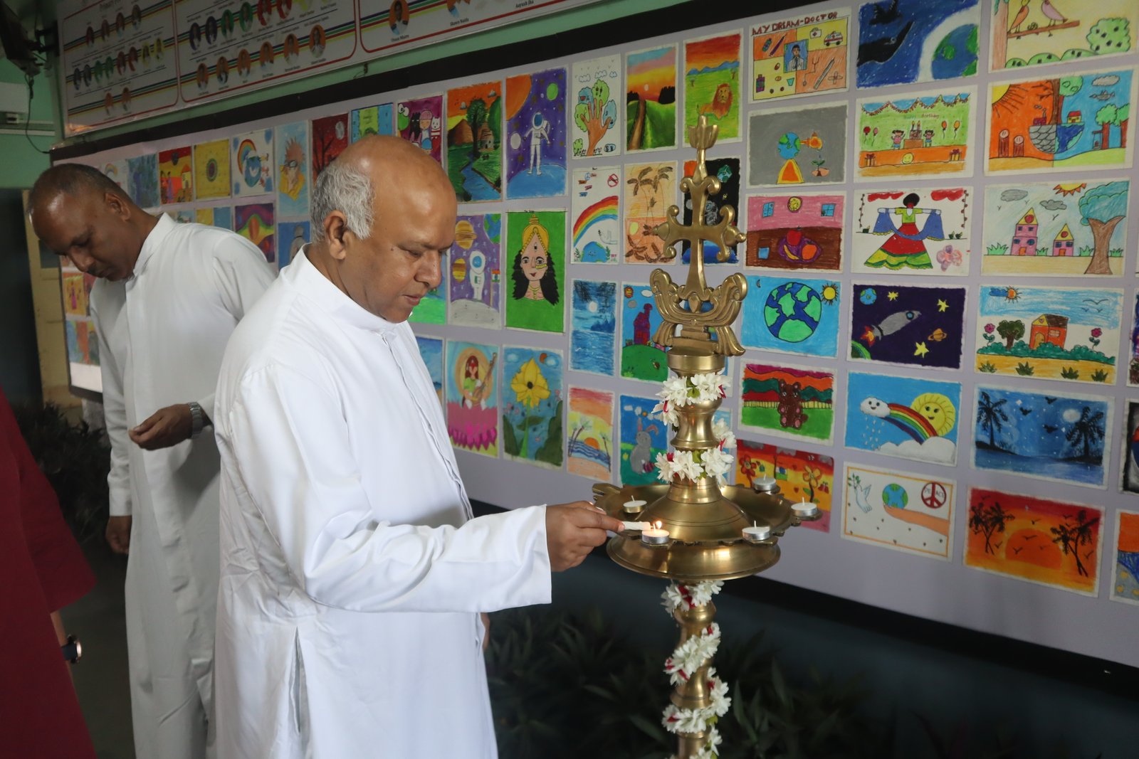The exhibition was thoughtfully divided into three thematic categories: For students from Class 1 to 4, the category “Exploratory Themes” allowed the youngest learners to explore art as a joyful discovery. Their artwork was full of colour, innocence, curiosity, and the natural wonder with which children view the world. Many of these works reflected scenes of family, nature, animals, friendship, and everyday acts of kindness. Students from Class 5 to 7 participated under the category “Footprints of Love.” Here, the focus shifted to artworks that represented empathy, care for others, and the beauty of relationships that support and nurture growth. Students expressed themes such as helping the needy, protecting the environment, cherishing family bonds, and respecting elders. The artworks showed thoughtful selection of colour palettes and growing confidence in technique. The underlying message was clear and powerful: love leaves traces wherever it goes. For the senior group, Class 8 to 12, the category “Footprints of Hope” encouraged reflection on challenges, aspirations, resilience, and the call to be messengers of hope in the world. Their works were profound and expressive, dealing with themes such as peace-building, inclusion, climate responsibility, faith in adversity, the impact of AI and the importance of collective human effort. This section drew many viewers to pause and contemplate.