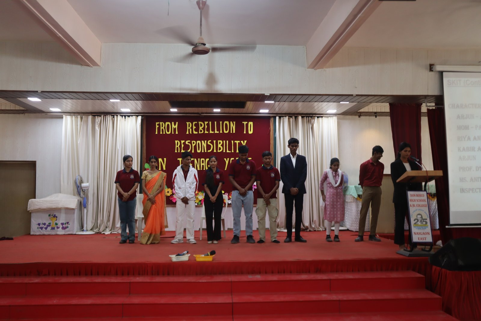 Don Bosco High School and Junior College, Naigaon (E), conducted a meaningful Value-Based Assembly on the theme “From Rebellion to Responsibility in Teenage Years.” on 10th December 2025 at 10 am in the school Hall. Organized by the students of Class XI Science, the program focused on one of adolescence’s most defining transitions — the journey from impulsive rebellion to thoughtful responsibility.