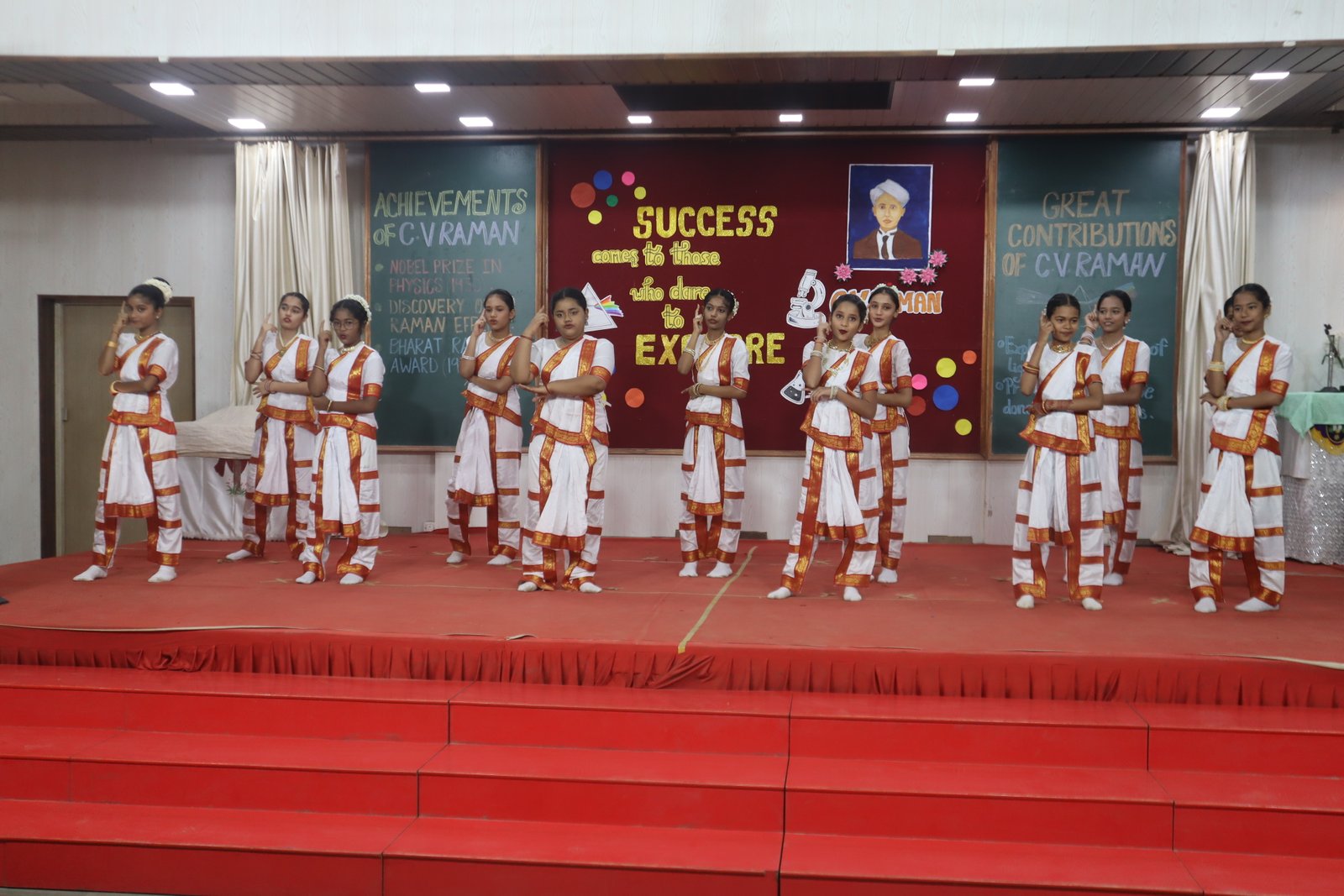 Under the guidance of their teachers, students from both the primary and secondary sections collaboratively presented a well-curated programme featuring skits, dances, and speeches. The skit portrayed key milestones in Raman’s life — from his early fascination with science to the discovery of the Raman Effect — while speeches emphasized his contribution to modern physics and India’s scientific legacy. Informative quotes enlightened students about Raman’s determination, simplicity, and dedication to research, inspiring them to pursue knowledge with passion and integrity.